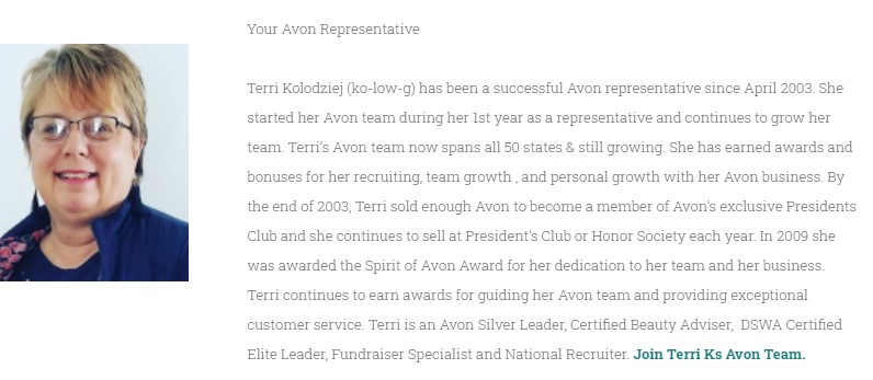 Terri Kolodziej (ko-low-g) has been a successful Avon representative since April 2003. She started her Avon team during her 1st year as a representative and continues to grow her team. Terriโs Avon team now spans 43 states & still growing. She has earned awards and bonuses for her recruiting, team growth , and personal growth with her Avon business. By the end of 2003, Terri sold enough Avon to become a member of Avonโs exclusive Presidents Club and she continues to sell at Presidentโs Club or Honor Society each year. In 2009 she was awarded the Spirit of Avon Award for her dedication to her team and her business. Terri continues to earn awards for guiding her Avon team and providing exceptional customer service. Terri is an Avon Silver Leader, Certified Beauty Adviser, DSWA Certified Elite Leader, Fundraiser Specialist and National Recruiter. Join Terri Ks Avon Team.