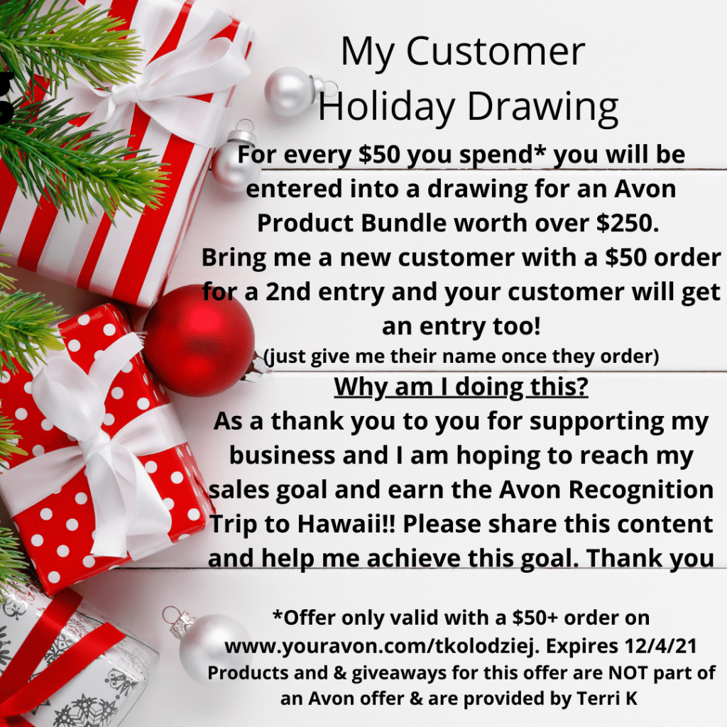 ** Raffles are sponsored by Avon representative Terri Kolodziej, not The Avon Company. Must be 18 yrs or older. US residents only. Raffle winners items shipped separately. 1 winner per campaign in campaigns 24, 25, & 26 .