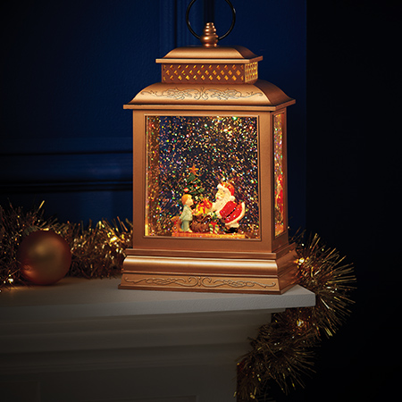 Santa delivers! Gilded lantern with Santa delivering gifts as glittery snow falls. Switch for lights with or without sound on. Just 1 of many new holiday home items.