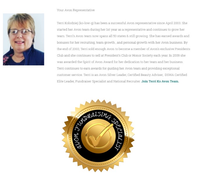 Terri Kolodziej (ko-low-g) has been a successful Avon representative since April 2003. She started her Avon team during her 1st year as a representative and continues to grow her team. Terriโs Avon team now spans all 50 states & still growing. She has earned awards and bonuses for her recruiting, team growth , and personal growth with her Avon business. By the end of 2003, Terri sold enough Avon to become a member of Avonโs exclusive Presidents Club and she continues to sell at Presidentโs Club or Honor Society each year. In 2009 she was awarded the Spirit of Avon Award for her dedication to her team and her business. Terri continues to earn awards for guiding her Avon team and providing exceptional customer service. Terri is an Avon Silver Leader, Certified Beauty Adviser, DSWA Certified Elite Leader, Fundraiser Specialist and National Recruiter. Join Terri Ks Avon Team.