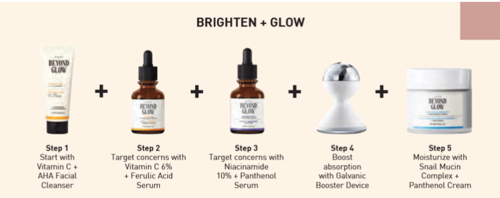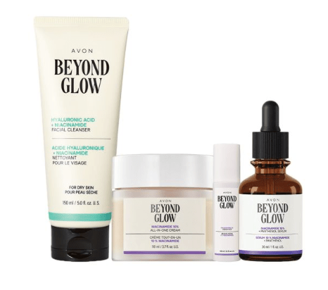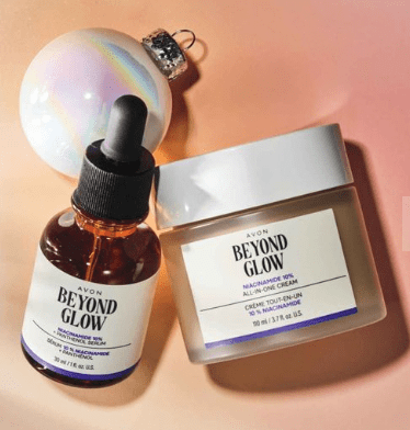 โข Beyond Glow Niacinamide 10% + Panthenol Serum Helps improve even tone and elasticity. 1 fl. oz. โข Beyond Glow Niacinamide 10% All-in-One Cream Visibly brightens skin and reduces fine lines. 3.7 fl. oz.