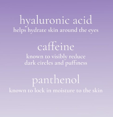 KEY INGREDIENTSโฏ โข Niacinamide โ Helps brighten skin and visibly evens tone โข Hyaluronic Acid โ Helps hydrate skin around the eyes โข Caffeine โ Known to visibly reduce dark circles and puffiness on skin โข Panthenol โ Known to lock in moisture to the skin